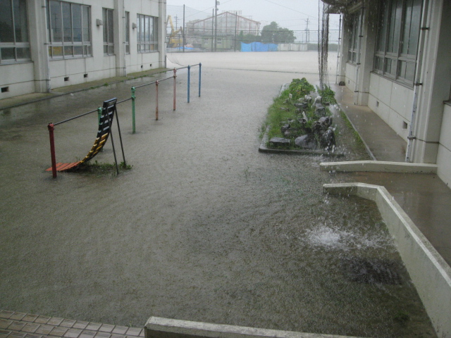 大雨洪水警報が発令され、大変な大雨になっています。グリーンステージや運動場、中庭は水浸しで水が浮いています。体育館やランチルームは雨漏り(構造上の問題だそうです)がしています。洪水などの被害が出ないように祈っています。