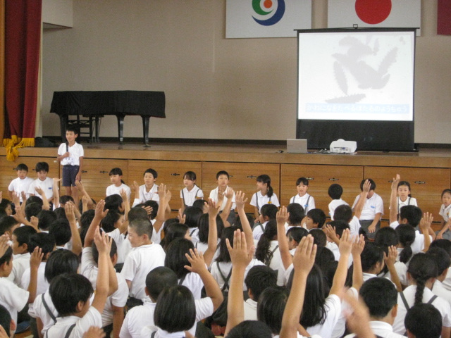 6月3日(水)児童集会は、飼育委員会の発表でした。学びの森で飼育しているホタルの一生をクイズにして発表しました。