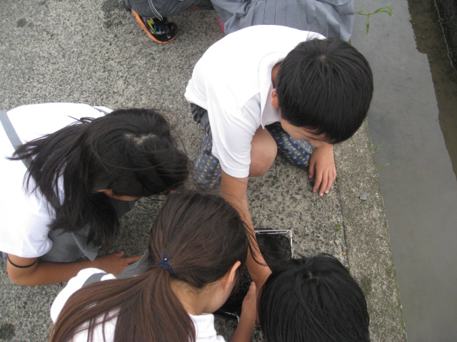飼育委員会で、委員会活動の時間にカワニナを捕りに近くの用水路に行きました。ホタルの幼虫はカワニナをえさとして食べます。最初はカワニナだけを捕っていたのですが、タナゴやエビ捕りに夢中になっている子どももいました。下の写真は、生まれたばかりのホタルの幼虫がカワニナに群がって、食べているところです。