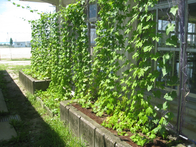 4年生が理科の時間に、ツルレイシとヘチマを植えています。ランチルーム南側と西側(農村グランド側)のグリーンカーテンにもなっています。(ランチルームは非常に暑いのでグリーンカーテンにしています)同じ日に種を植えましたが、成長に大きな違いがあります。どちらが南側でどちらが西側でしょうか。