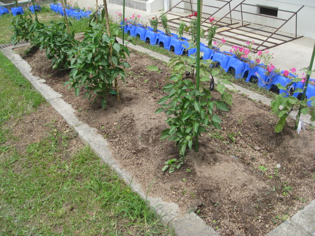1年生の学級園にはアサガオ、ヒマワリ、オクラ等を、2年生の学級園にはピーマンとナスを植えてあります。