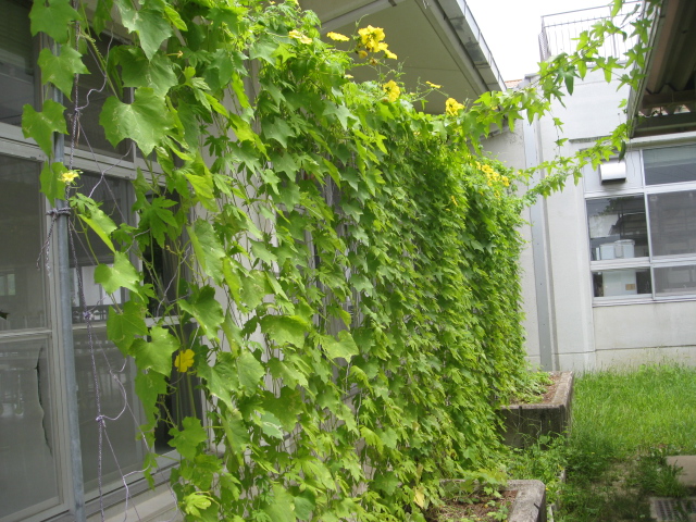 4年生が育てている西側(農村グランド側)のツルレイシ(ゴーヤ、ニガゴリ)やヘチマもこの2週間で大きく成長しています。南側はテント倉庫の屋根まで伸びています。ランチルームのグリーンカーテンになっています。
