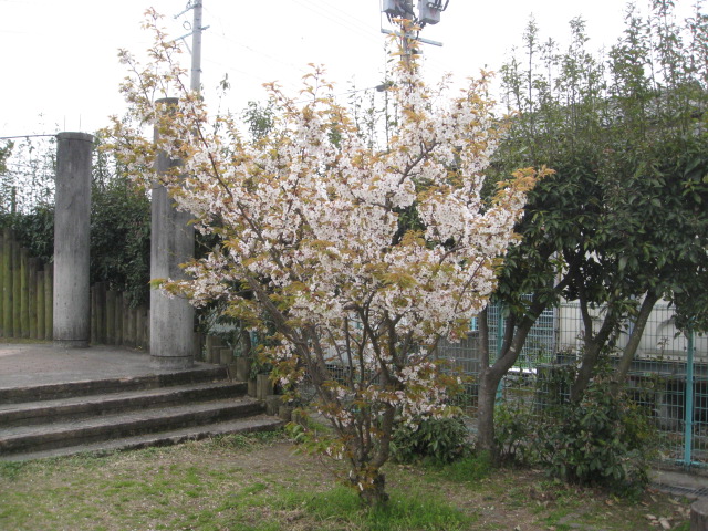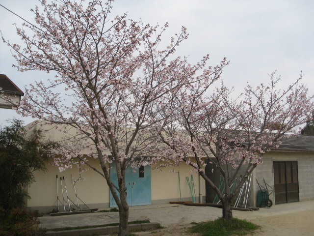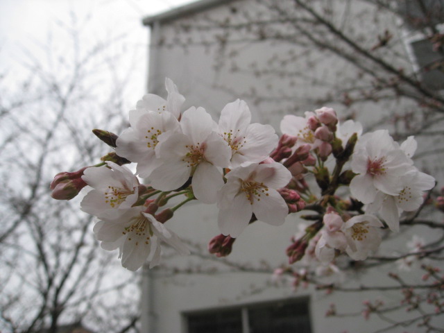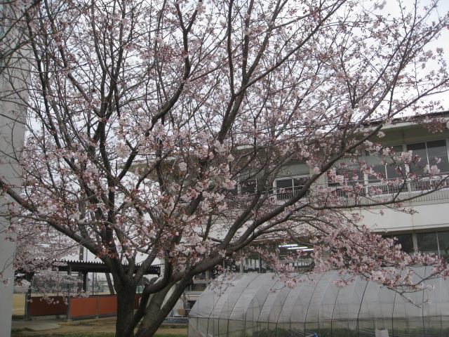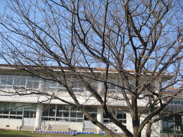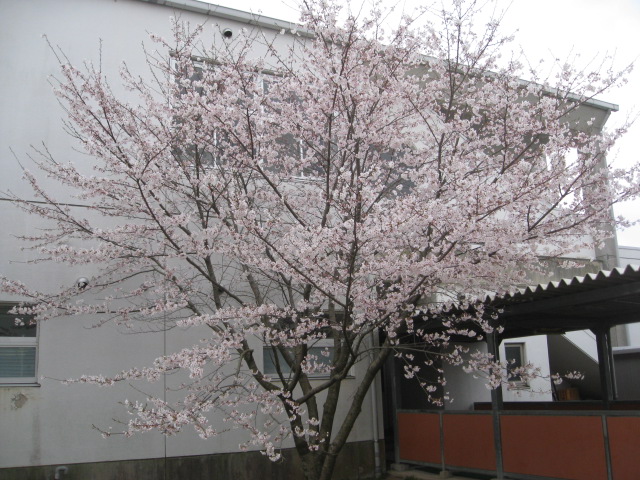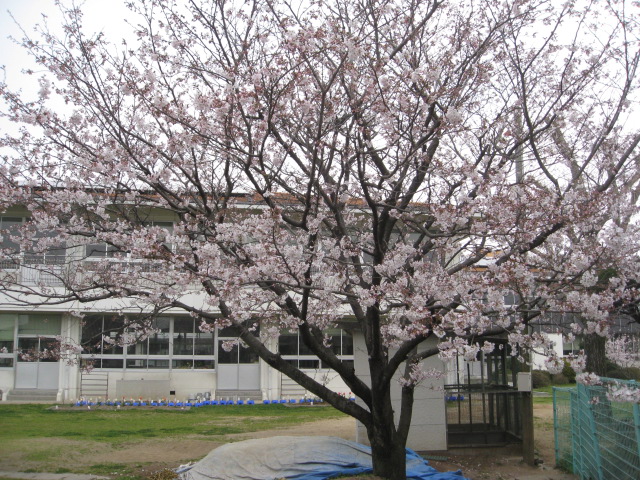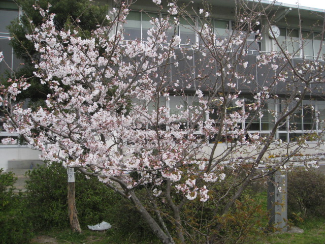 サクラが開花していました。20輪ほど咲いていたので「横島小サクラ開花宣言」を出してもいいのかなと思います。旧パソコン室(横島図書館)側のサクラです。他のサクラはまだ咲いていないので、微妙に条件が違うようです。