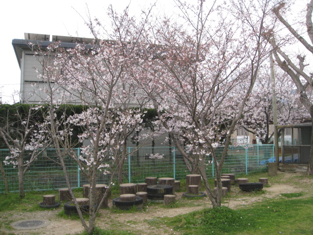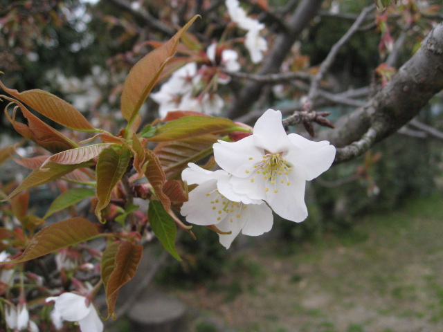 3/23(水)サクラ(ソメイヨシノ)の咲いている花が少し増えていました。50輪ほど咲いています。また、グリーンステージのヤマザクラも咲き始めました。開花と同時に若葉も出ています。卒業式に合わせるように開花してくれました。