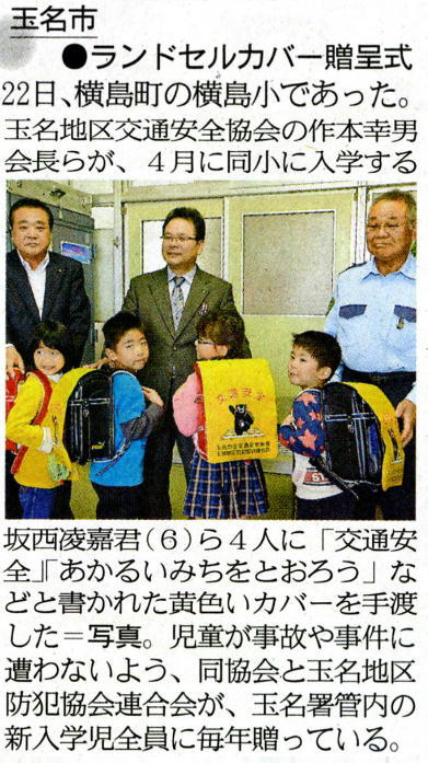 安全協会よりランドセルカバーを新1年生にいただきました。熊日新聞に掲載されていました。