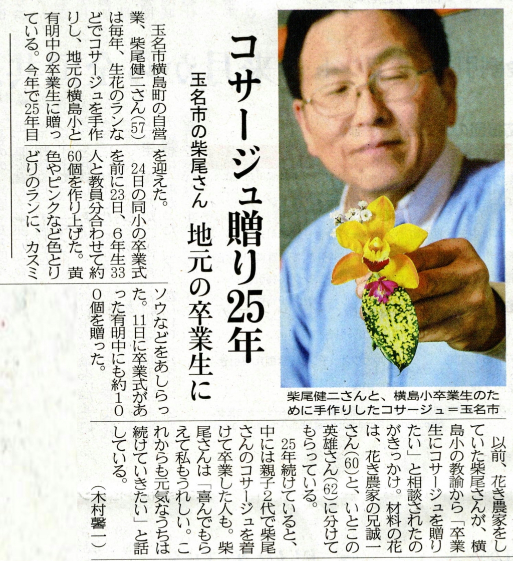 卒業式に卒業生や職員がつけるコサージュを柴尾さんが作って贈られていることが、熊日新聞に載っていました。NHKでも放送されました。