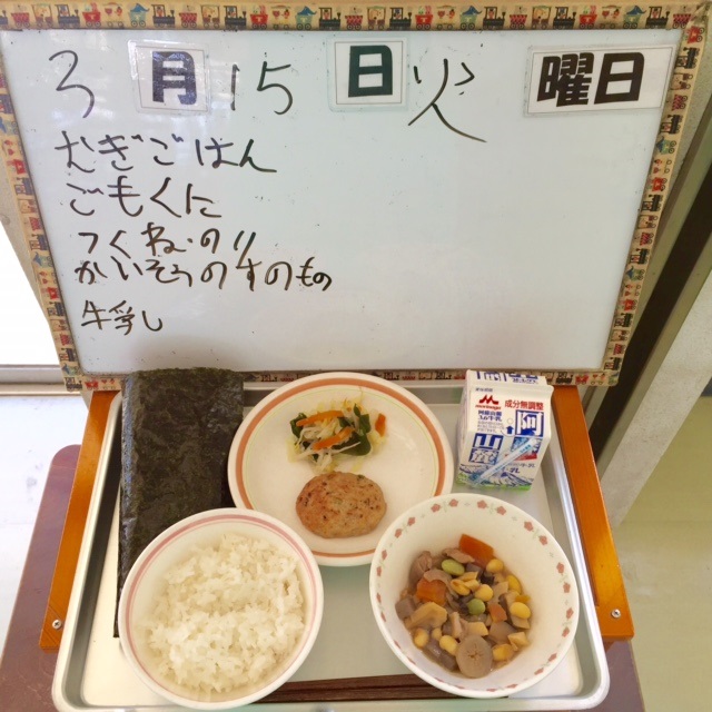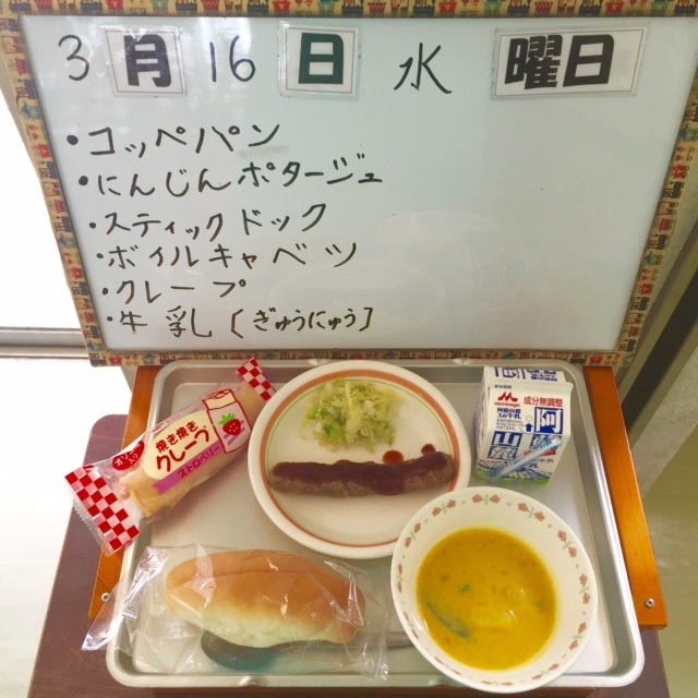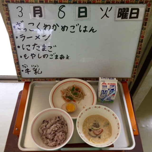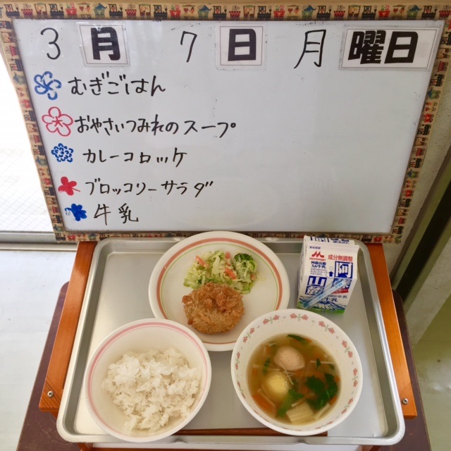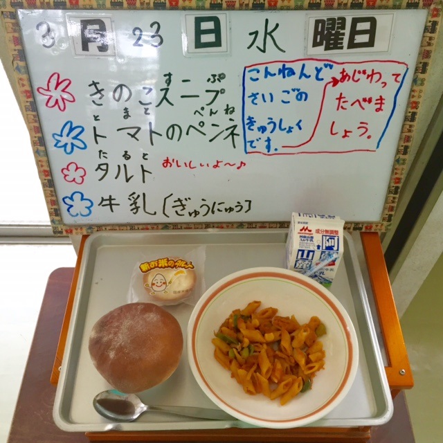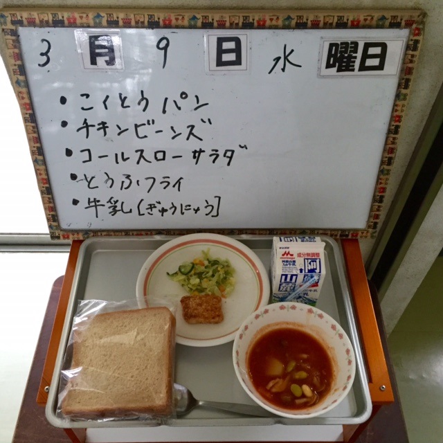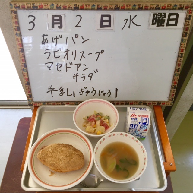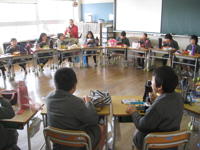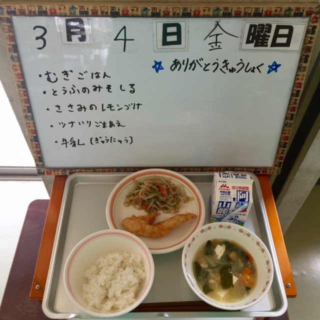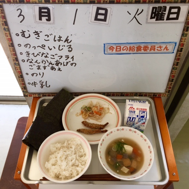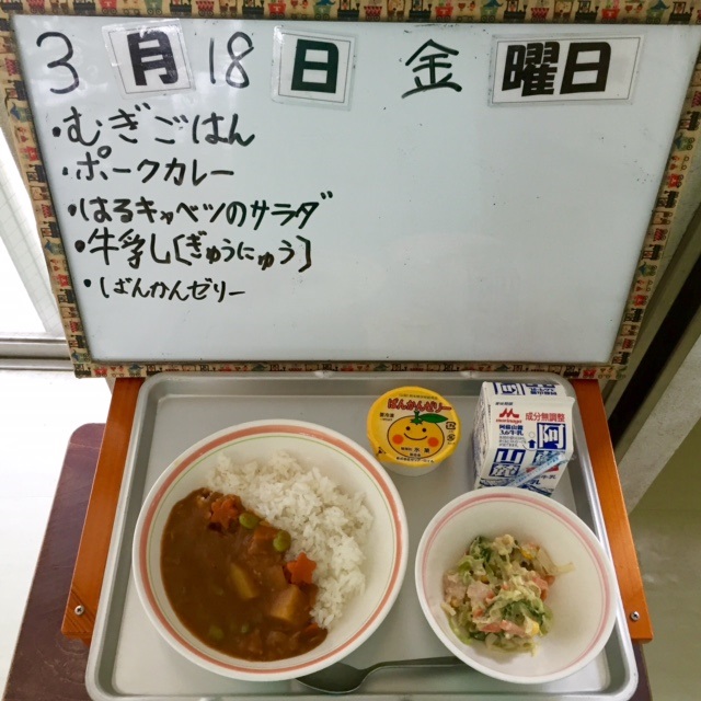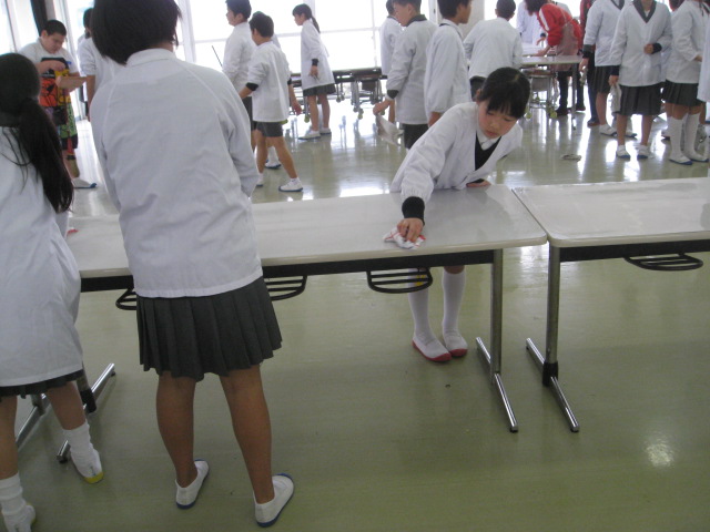 本年度最後の給食でした。自校方式でランチルームで全校児童が一緒に給食を食べています。最後にテーブル磨き、床磨きをしました。