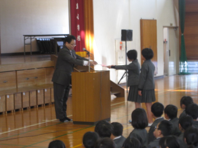 修了式がありました。全員が進級しますので、修了証を校長先生からクラス代表が受け取りました。このあと学活で担任から全員が修了証や通知表を受け取りました。