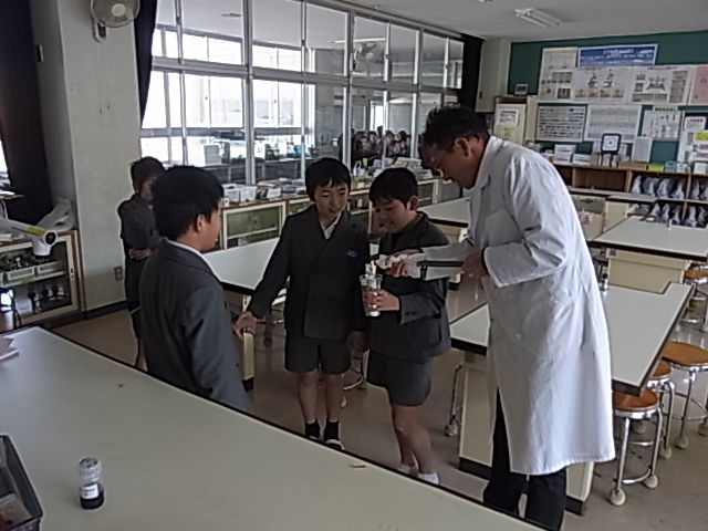 3/14(月)保護者にかすみ草(白)をたくさんいただきましたので、職員室や理科室でも分けてもらいました。理科の教材である切り花用着色剤(赤、黄、青)につけたら、色がつきました。かすみ草をいただき、ありがとうございました。