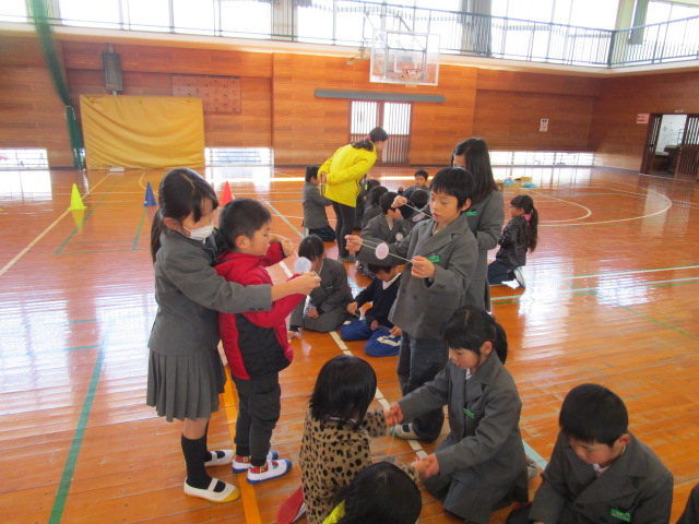 3/1(火)2年生が、横島幼稚園保育園の年長さんを呼んで、一緒に遊びました。4月の入学がスムーズになればと思います。