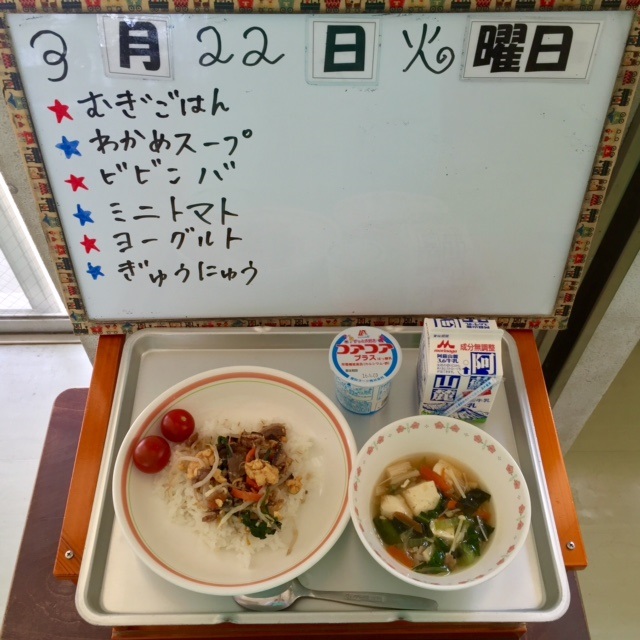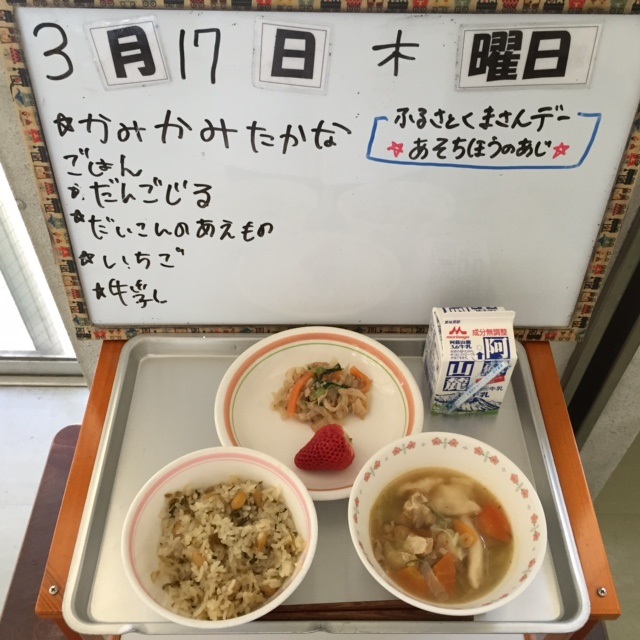 給食への感謝(調理の先生方、保護者、地域、食料等)の気持ちを表す「ありがとう給食」を行いました。横島小学校は大変恵まれていてランチルームがあり自校方式の給食が食べられます。