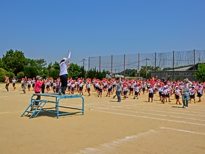 5/20(金) 今日の全体練習では、開会式、閉会式を練習しました。ラジオ体操や校歌の練習をしました。また、紅白対抗リレーの練習と支会対抗リレーの選手決めもしました。
