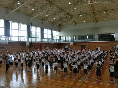5/11(水) 業間に児童集会がありました。今日は体育委員会の発表でした。運動会に向けて、ラジオ体操第一の練習をしました。