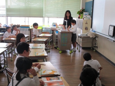 1年生の前で、2年生がお手本を示していました。 H28.5.16