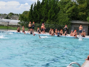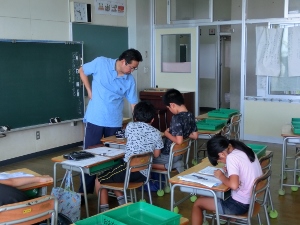 7/26(火) 学習教室一日目。主に夏休みの宿題に取り組んでいます。教室は暑いですが、分からないところを先生に聞いてがんばっていました。学習教室のあとは水泳教室がありました。