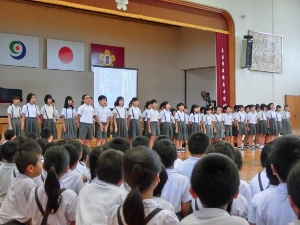 7/13(水) 音読集会で6年生が発表しました。清少納言の枕草子を音読しました。