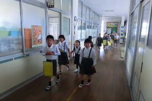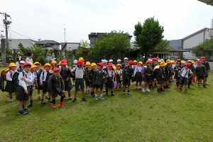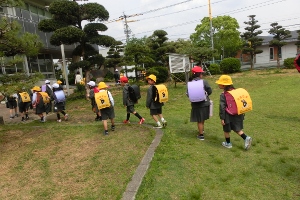 4/27(木) 家庭訪問、お世話になっています。4時間で下校するので、1・2年生で一斉下校をしています。2年生の班長さんが1年生のお世話をがんばっています。