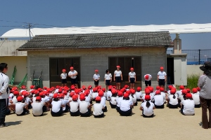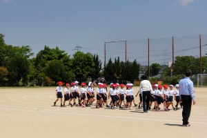 5/18(木) 今日から運動会の全体練習が始まりました。今日は、入場行進と退場の仕方を練習しました。1年生も初めての行進をがんばっています。それぞれの団に分かれて応援の練習もしました。