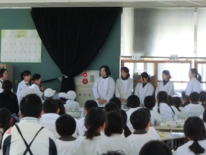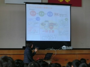 1/26(金) 給食集会がありました。栄養職員の広瀬先生が、お弁当の日に向けて、お弁当の作り方のお話をしてくださいました。また、給食委員会の発表があり、給食に関するクイズをしてくれました。
