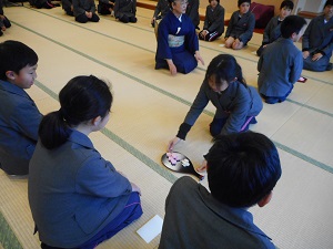1/19(金) 今日は5年生が茶道の実習をしました。学校にある畳の部屋は狭いので、公民館の広い和室でおこないました。