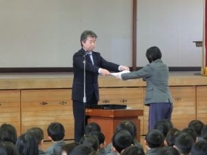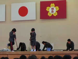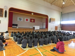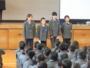 1/9(火) 後期後半がスタートしました。5時間目に集会があり、校長先生や生活指導担当の先生からお話がありました。また、清掃美化委員会の発表と、4年生の音読発表がありました。百人一首の発表でした。