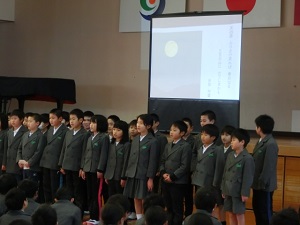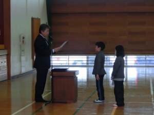 2/1(木) 今日から2月です。月初め集会がありました。書初め大会と、バスケットボールの表彰がありました。また、運営委員会の6年生が挨拶をしました。最後に、3年生が「ことわざ」の音読発表をしました。