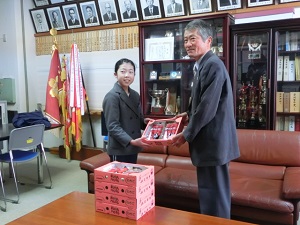 2/2(金) いちごの贈呈式がありました。JA玉名の方から、新鮮ないちご(ゆうべに)をいただきました。早速、今日の給食でいただきます。ありがとうございました。