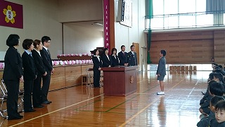 新しい先生方の就任式を行いました。写真は、児童代表による「歓迎