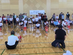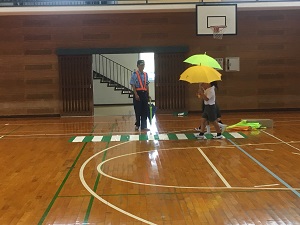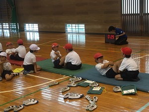 雨で、運動場が使えなかったため、体育館とワークスペースを使って行いました。