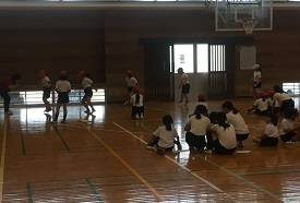 体育館でできる、長座体前屈や反復横跳び、立ち幅跳び、上体起こしなどに取り組みました。高学年は、低学年のお世話をしてくれ、大変助かりました。