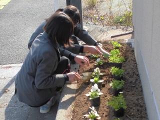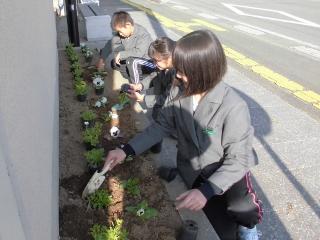 12月20日(金) 掃除の時間に教頭先生と6年生(職員室掃除担当3名)が、旧バス停後ろの花壇に花の苗を植えました。ありがとうございました。