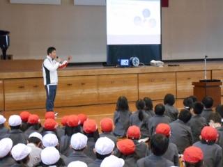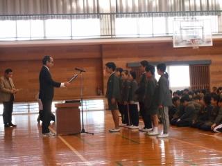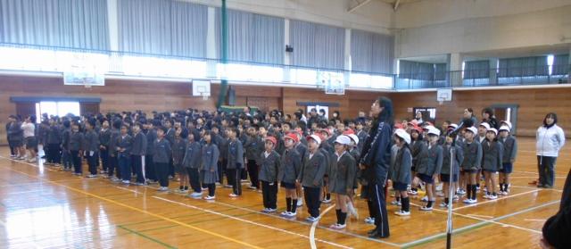 12月24日(火) 冬休み前集会では、最初に表彰をした後、生徒指導担当から生活の仕方について、保健担当から虫歯の治療と感染症予防について、私からは、タクシーのドライバーさんに褒めて頂いた横断歩道を渡った後のお礼のお話を伝え、地域での挨拶を頑張ろうと伝えました。最後に校歌をみんなで歌って終えました。