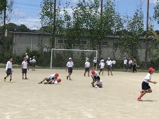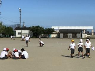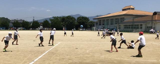 6月15日(月) 昼休みの様子です。学級でドッヂボ-ルをしているクラス。グリーンステージで縄跳びと鬼ごっこの鬼決めをしようとしているところです。