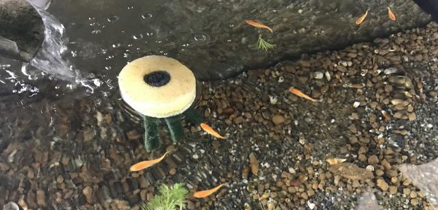 6月16日(火) 昨日頂いためだかが、水槽に入れられました。玄関の小さな水槽に6匹、理科室前の大きな水槽に14匹です。白くて丸い浮いている物は、たまご取りです。めだかがこれにたまごを産み付けるのだそうです。今から楽しみです。