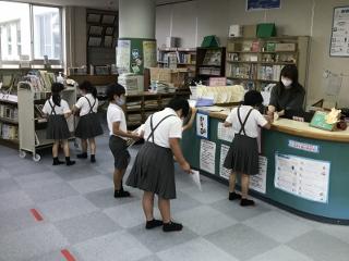 6月12日(金) 朝の図書室の様子です。距離をとる線に並び、ルールを守って本を借りていました。