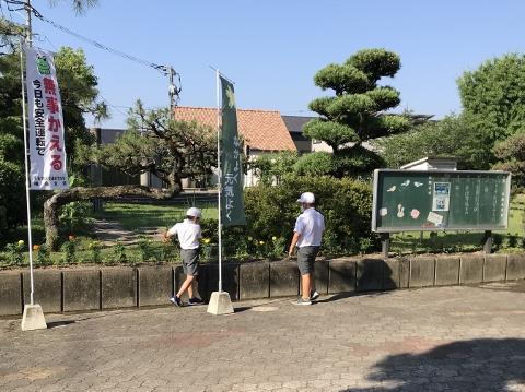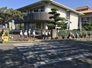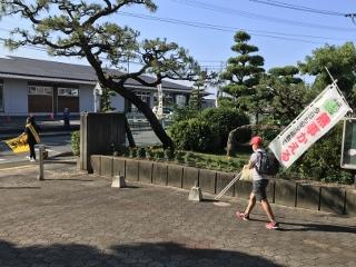 6月22日(月) 毎朝、運営委員が玄関前ののぼり旗を立ててくれています。いつもありがとう。もう一枚は、6年生のあいさつプロジェクトの様子です。