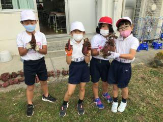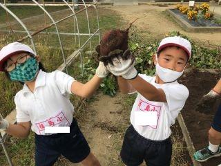 11月19日(木)今日は、2年生が芋ほりをしました。最初は、ナメクジや幼虫、ミミズなどを見て土に触れるのを嫌がっている子供もいましたが、慣れてくるにしたがって大きい芋があったと楽しそうに芋ほりを楽しんでいました。このあと、つるを使ったリースづくりも予定されているようです。