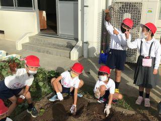11月19日(木)今日は、2年生が芋ほりをしました。最初は、ナメクジや幼虫、ミミズなどを見て土に触れるのを嫌がっている子供もいましたが、慣れてくるにしたがって大きい芋があったと楽しそうに芋ほりを楽しんでいました。このあと、つるを使ったリースづくりも予定されているようです。