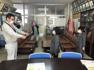 3月15日(月) 以前お伝えしていたブリジストンの絵画展の結果ですが、今日校長室で表彰をしていただきました。2年生の伊藤さんと溝江さんです。二人は、とても緊張した様子でしたが、賞状や景品をいただき、車にプリントされた絵を見てとても喜んでいました。
