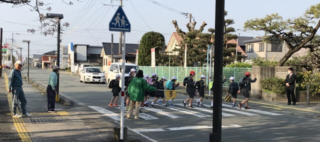 4月10日(金) 朝の学校前の登校の様子です。地域の方のご協力いつもありがとうございます。