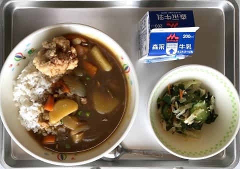 給食再開 投稿日時 : 2020/04/13 承認者 4月13日(月) 久しぶりの給食でした。・・・が、次は5月7日以降になります。 メニューは、①むぎご飯 ②ポークカレー ③トリの唐揚げ ④かいそうサラダ ⑤牛乳でした。