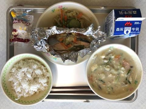 今日のメニューは、①むぎごはん ②サケのちゃんちゃんやき ③甘酢あえ ④ごじる ⑤牛乳です。