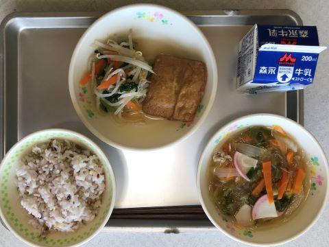 今日のメニューは、①ざっこくご飯 ②にくづめイナリ ③ピーナッツあえ ④はるさめ汁 ⑤牛乳です。