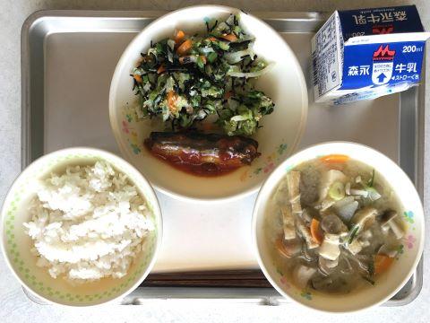 今日のメニューは、①むぎごはん ②さんまの甘露煮 ③切り干し大根の酢の物 ④ふしそうめん汁 ⑤牛乳でした。