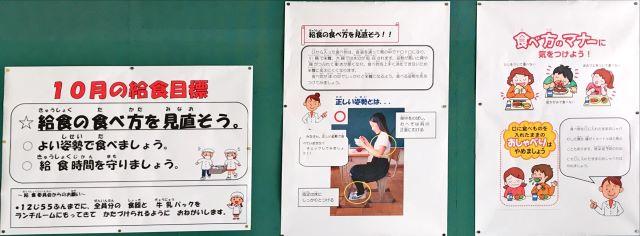 今日のメニューは、①むぎごはん ②イワシのトマト煮 ③ひじきの和え物 ④きのこのみそ汁 ⑤牛乳です。10月の掲示物が変わりましたので、掲載しました。