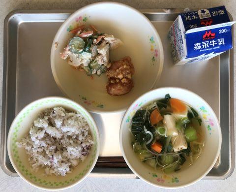 今日のメニューは、①ゆかりご飯 ②とりのから揚げ ③れんこんサラダ ④うおそうめん汁 ⑤牛乳です。