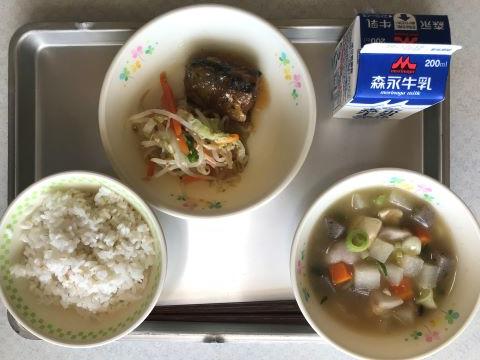 今日のメニューは、①むぎご飯 ②サンマのみぞれに ③もやしのごま和え ④のっぺい汁 ⑤牛乳です。
