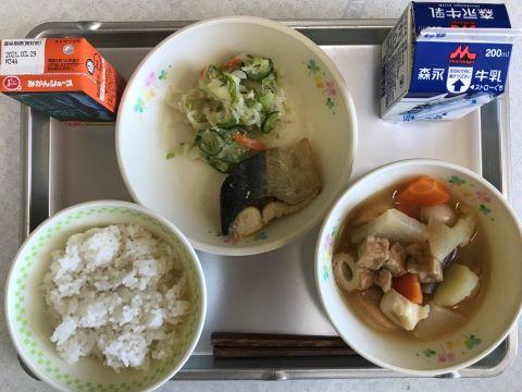 今日のメニューは、①むぎごはん ②さかなの黄金焼き ③ジャガイモのみそ汁 ④かきなます ⑤牛乳です。
