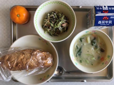 今日のメニューは、①あげパン ②クリーム煮 ③ひじきサラダ ④みかん ⑤牛乳です。