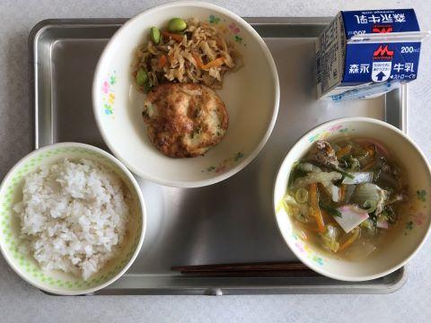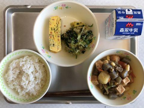 今日のメニューは、①むぎごはん ②だいずの五目煮 ③カラフル卵焼き ④キャベツのおかかあえ ⑤牛乳です。